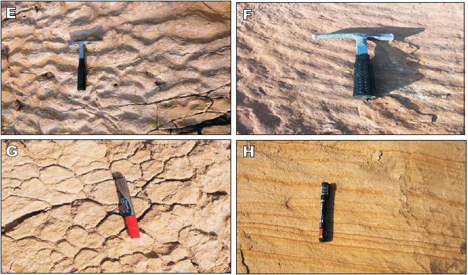 This facies is composed of very thinly laminated, whitish-brown, 2m-thick sandstone beds occurring at two stratigraphic levels. Mud cracks occur locally (Fig. 3G). Beds are tabular and some have rippled tops. They are mostly evenly laminated. Some beds have combination of horizontal lamination and low-angle cross-beds (Fig. 3H). Their contacts are sharp. Mud drapes occur within this unit.
