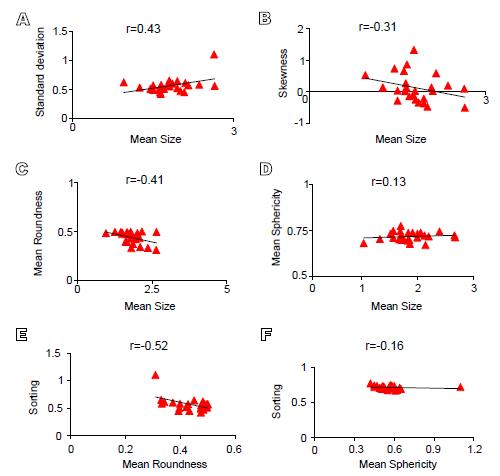 Bivariant plot of the Fort Member sandstones A) mean size versus standard deviation, B) mean size versus skewness, C) mean size versus mean roundness, D) mean size versus mean sphericity, E) mean roundness versus sorting and F) mean sphericity versus sorting.