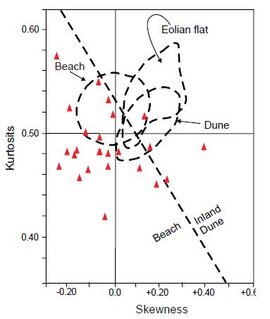 Mason and Folk (1958) and Moiola and Weiser (1968) have proposed a plot of kurtosis versus skewness to distinguish among beach, dune and Aeolian flat sands and between inland dune and beach sands. In the present case, such plots yield inconclusive results because most samples lie within the beach and dune fields discriminated by Mason and Folk (1958). However, according to Moiola and Weiser’s diagram sandstones plot mostly in coastal environments and a minor contribution from the inland dune environments (Fig. 7).
