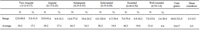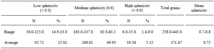 The studied sandstones are medium to coarse-grained, moderately sorted to well sorted, near symmetrical and mesokurtic to platykurtic. The quartz grains are subangular to subrounded and show medium to high sphericity (Tables 2, 3, 4). Their mean size was plotted against their sorting. The 0.03 correlation coefficient indicates that the mean size of the grains decreases with the increase in sorting. Mean size versus skewness plot with a correlation coefficient of -0.3 show moderate inverse relationship between the two parameters. Mean size versus roundness plot show an inverse relationship with their correlation coefficient value of -0.41 that suggest that decrease in size is accompanied by decrease in roundness of quartz grains. Roundness versus sorting has correlation coefficient value of 0.52 which suggest that sorting of grains decrease as their roundness decrease. Sphericity is plotted against sorting and the correlation coefficient value for the plot -0.160 shows a weak relationship between sorting and sphericity. Sorting of the grains decreases as their sphericity decreases (Fig. 4A-F).