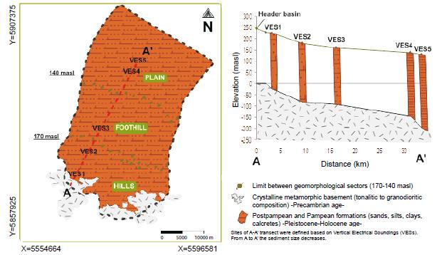 In the Pampean basin, the Langueyú creek basin (600km2) is located in the Centre-Southeast of Buenos Aires province with headwaters in the Tandilia hilly system and regional groundwater discharge in the Salado river basin.