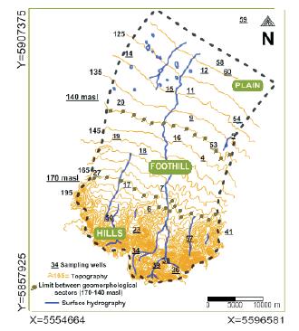 The depths of the sampled wells ranged between 2m and 3m below the water table of the phreatic aquifer. These shallow wells were either hand or machine excavated, and all had a pumping system (hand pumps, mills or electrical submersible pumps) and a well cap. Groundwater samples were collected from the installed pumps after at least 4 minutes of well purging. The sampling was carried out in June 2011, coinciding with the dry season. Since it was also the coldest period, evapotranspiration decreased and yielded a positive hydric balance.