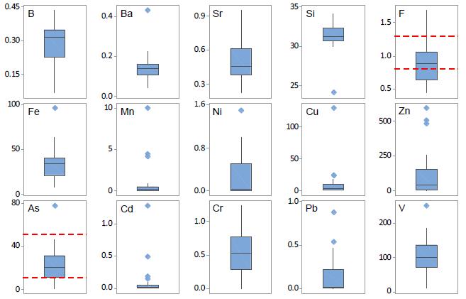 The Box and Whisker plots of the trace elements analyzed in the 28 groundwater samples are displayed in Figure 4. The lower and upper limits of the box represent the first and third quartiles, and the line inside the box is the median. The whiskers extend to ±1.5IQR (interquartile range) from the respective quartile. Symbols represent outlying values. The dashed lines in the F box plot represent the range of recommended concentrations of F in drinking water (0.8 to 1.3mg/L) for the Tandil area according to CAA; dashed lines in the As box plot indicate maximum allowable concentration of As in drinking water according to CAA (50mg/L) and WHO (10mg/L). For the rest of elements, the maximum allowable concentrations are further above the maximum values found in groundwater samples and were not represented.