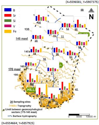 The spatial distribution of B, Fe, Si, Sr and V in some groundwater samples from the Langueyú creek basin is depicted in Figure 7. V and B show a positive correlation with As whereas Sr and Fe are expected to follow a different pattern as they are negatively correlated with the As group. In addition, despite the limited number of plotted samples, the different distribution patterns of the selected elements are observed. Fe and Sr peak up at the South of the basin in the hilly area of the Tandilia system, decreasing towards the North. On the contrary, V and B concentrations increase from South to North, in the groundwater flow direction, like As and F. Si shows a steady concentration in the Langueyú creek basin.