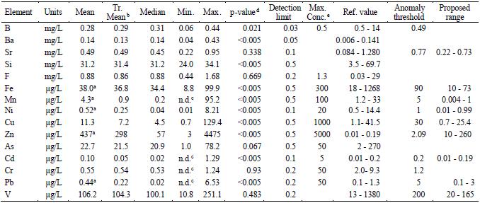 Table 1 shows some statistical parameters describing the distribution of trace elements in the analysed samples. Some elements show large variations in the groundwater samples from the Langueyú creek basin, with mean values generally lower than the median ones, thus pointing to the existence of large upper tails. The Anderson and Darling test was applied to identify departures from normality, and variables with p-value<0.005 were considered very asymmetrical. As, B, Cr, F, Sr and V were normal or close to normal parameters. It must be noted that this group comprises most elements considered of natural origin. For the elements showing very large outliers, the trimmed or truncated mean, obtained after discarding 5% of values at the upper and lower tails, was preferred over the mean to show central tendency of the variable.