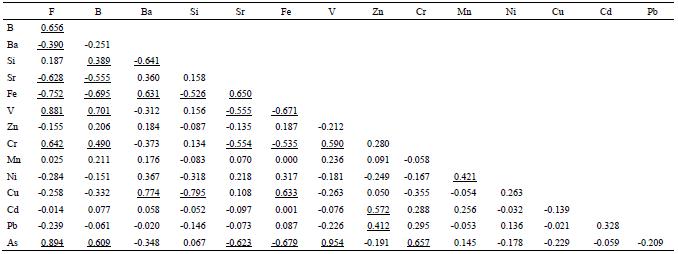 Pearson’s bivariate correlation coefficients between 15 trace elements. Critical r value is 0.374 for 26 (n-2) degrees of freedom and 95% confidence level. Significant correlations are underlined