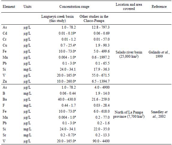 Table 3 summarizes the concentrations of trace elements found in groundwaters from different sectors of the Chaco- Pampean plain and compares them with the values found in the angueyú creek basin. The results obtained by Galindo et al. (1999) in the Salado river basin are much higher for all the elements than the concentrations found in the Langueyú creek basin. Therefore, for all elements except As and Cr, the proposed range has been based on results from the Langueyú creek basin after removing individual values associated with anthropic contamination. The higher concentrations of trace elements found in the Salado river basin could be attributed to the longer water-sediment contact time caused by the larger sediment thicknesses in the central region of the Salado basin.