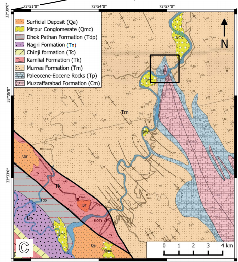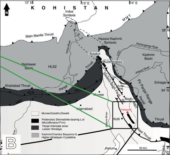 Kotli area lies on the SE of the Hazara-Kashmir Syntaxis (HKS) and is considered to be part of sub to lower Himalayas (Fig. 1B). The Main Boundary Thrust (MBT), trending in a NW-SE direction, has been demarcated by Wadia (1928) passing just South of the Kotli city (Fig. 1B). The two prominent structural features of the area are the Tattapani-Karela and the Palana-Divigarh plunging anticlines (Fig. 1C). These major folds are trending NW-SE and have fold axis parallel to that of the Pir Panjal Range (Wadia, 1928). Overall, the direction of compressive forces in the area seems to be NE-SW. Tattapani-Karela anticline is approx. 28km long and 4.5km wide with NW-SE trending axis with 15º–30º plunge (Fig.1C). The dolomitized stromatolitic limestone of the Muzaffarabad Formation (Cambrian) comprises the bulk of the anticline. In the study area, the Riasi Thrust, a part of the MBT (trending NW-SE), is located towards the southeast, marking a faulted contact between the Murree Formation and the Miocene to Pleistocene Middle Siwalik Group (Hussain et al., 2009; Thakur et al., 2010; Aadil and Rehman, 2013).