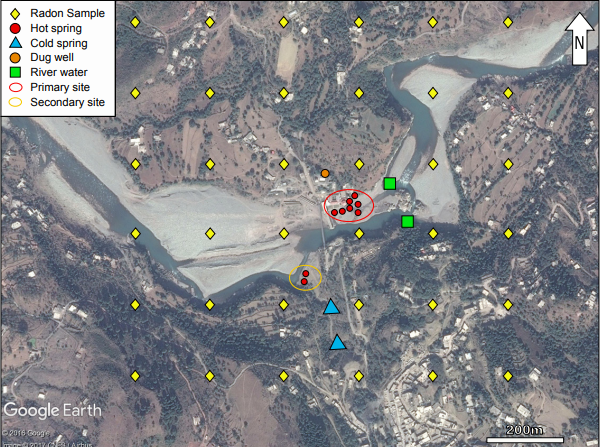 For soil-gas radon measurements, a sampling grid covering an area of 1km2 was designed and plotted around the hot springs (Fig. 2). In total, 36 equally spacing (200m) sampling points were contemplated to fulfil the purposes of sampling. RAD-7 Electronic Radon Detector (DURRIDGE Co., USA) was used for the measurement of radon concentration in the Tattapani area. A stainless soilgas probe was used for in-soil radon measurement. Alpha particle emission activity in the soil-air sample was recorded using RAD-7. Air was pumped into the instrument and allowed to circulate for 20min to record the alpha particle emission measurement. Measurement for radon in water was made on-site for samples collected from an open well, hot springs and cold springs. The RAD H2O technique of RAD-7 was used to calculate the concentration of radon levels in water samples. This took about 30min.