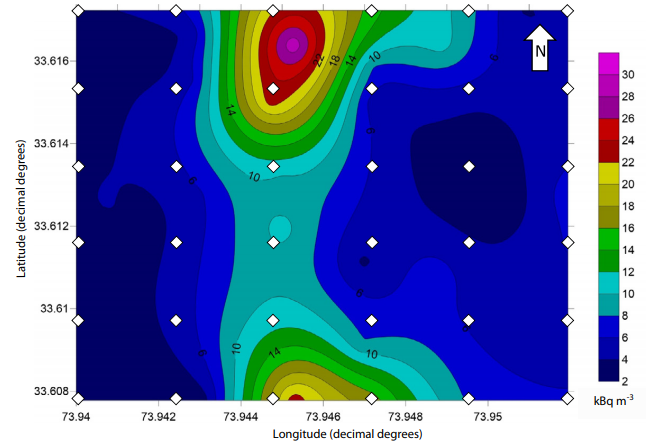 Contour map showing the spatial variability of radon concentration over the study area. The empty diamond symbols show the location of the radon sampling points.