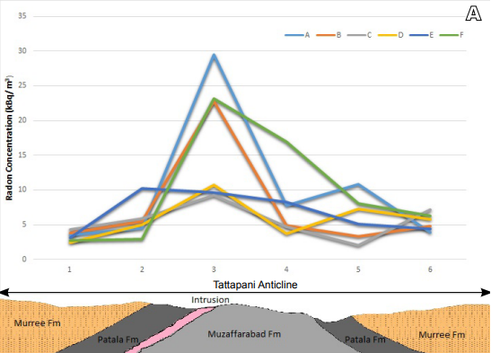 Data from six traverse lines of the grid (A, B, C, D, E and F) that run across the Tattapani anticline was plotted to evaluate the effect of lithological changes over radon concentration as shown in Figure 4. Radon releasing capacity of rocks and soil (Morawska and Phillips, 1993), host rock permeability and flow of carrier gases (CO2, CH4, N2 and He) were found to be the influencing factors for in-soil radon concentration, analysed at surface conditions (Ball et al., 1991). The increase in radon concentration is associated with the escape of soluble radon from water at high temperatures. The shales of the Patala Formation have prominent radon concentration due to their high permeability. However, radon concentration is higher towards the shales exposed on the southwestern limb of the anticline (Fig. 4), indicating the presence of a subsurface source along the shale and carbonate contact, from which radon and other carrier gases (CO2, CH4, N2 and He) are following a direct escape route.