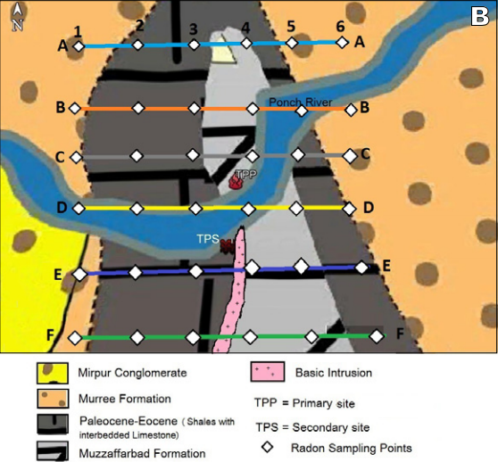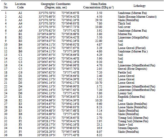 Out of 36 radon sampling locations, 6 points were located over the loose gravel (fluvial), 7 on the shaley rocks, 7 on the sandstone of the Murree Formation, 4 on the carbonates of the Muzaffarabad Formation and 12 on the thick soil covering the underlying rocks (Table I). Radon concentration varied between 2.1 and 29.5KBqm-3 with a mean value of 7.62KBqm-3 and standard deviation of 6.23KBqm-3 (Table I). Concentration of radon was highest at sampling point A3 and lowest at C5. Sampling points A3, B3, F3, and F4 showed high anomalous values relative to those of other locations. Variations in radon emission from different rocks and soils depend upon the permeability and structural components (faults / fractures) along with various climatic aspects (Mogro-Campero and Fleischer, 1977). Studies conducted worldwide have revealed a persistent low radon level emission from Earth’s crust to atmosphere except for sites of geological fault, uranium deposits, volcanoes and geothermal sources (Nishimura and Katsura, 1990). In the present study, the radon concentration was relatively low at sample points located on or near the river bank. Gravel deposited along the river bank was not consolidated, so the large interconnected pore spaces between the sediments possibly provide pathways for surface air to dilute the gases escaping from the subsurface (Table I).