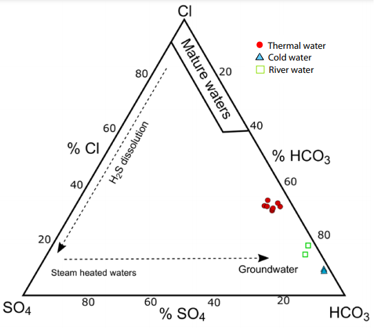 Cl-SO4-HCO3 ternary diagram (after Giggenbach and Goguel, 1989) showing that Tattapani hot springs are bicarbonate type.