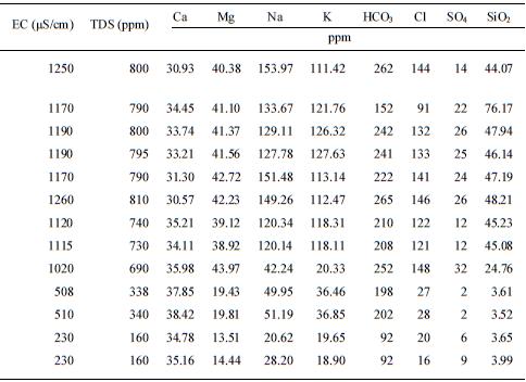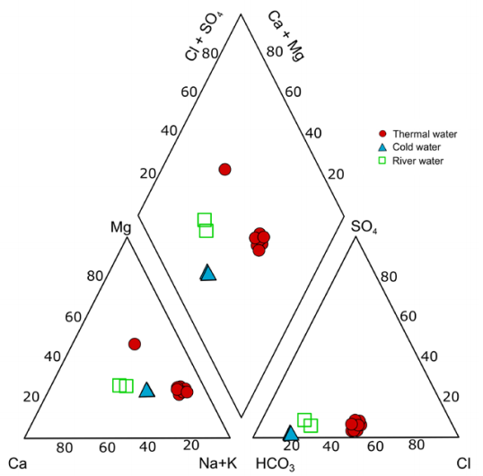 The results of the physical analyses of water samples from the study area are shown in Table II. Hot spring waters were slightly acidic with pH ranging 6.62 to 6.69, and temperature ranged from 54.8ºC (THS-8) to 60.8ºC (THS- 6). Flow rates were variable from one to another among hot springs, between 3.6 and 15.6Ls-1. Hot springs with larger discharge showed the highest temperatures, EC and TDS values, ranging from 1115 to 1260μS/cm and 730 to 810ppm, respectively. Water samples other than hot springs were slightly alkaline with lower values of EC, TDS and temperature. Dug well and fresh water samples from cold spring had values of EC and TDS relatively higher than river samples because of their interaction with rocks. Dug well sample (TDW-1) showed abnormal values (Table II) which could be caused by thermal water recharge.