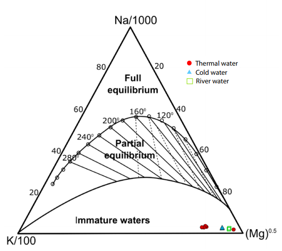 Na-K-Mg Ternary plot used to determine reservoir temperature and equilibrium between cations for geo-thermometry.