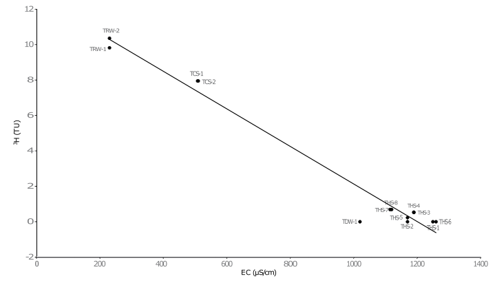 Relationship between electrical conductivity and tritium content of thermal water and shallow groundwater.