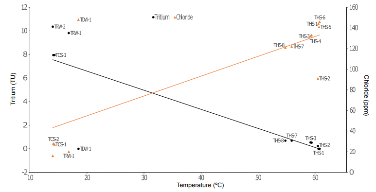 Relationship between temperature, chloride and tritium concentrations for thermal and groundwater.