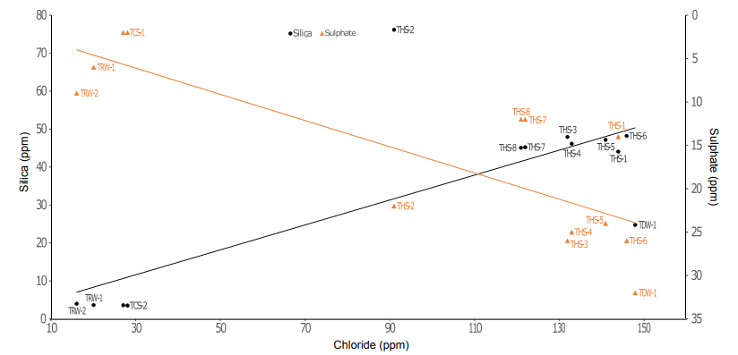 Relationship between chloride, silica and sulphate concentrations for thermal and groundwater.
