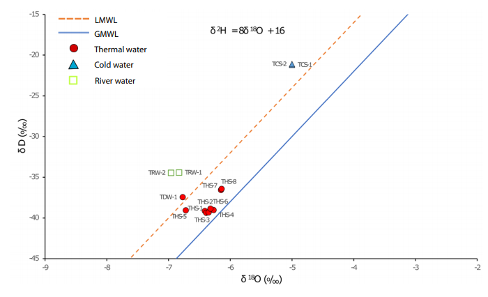 Isotopic signatures are used to differentiate the possible origin (magmatic, oceanic and meteoric) of thermal water (Faure, 1991). δ18O and δ2H values of all water samples from the Tattapanihot springs lie between -6.72 to -6.14‰ and -39.37 to -36.43‰, respectively (Table IV). This isotopic data does not indicate any significant contribution of magmatic water which generally has δ18O from +6 to +9‰ and δ2H from -40 to -80‰ (Pearson and Rightmire, 1980; Giggenbach, 1992). Normally, ocean water has δ18O and δ2H about 0‰ (V-SMOW). Depleted values of δ2H and δ18O rule out the contribution of oceanic water. These values lie close to the Local Meteoric Water Line (LMWL) of this area (Hussain et al., 1995), indicating a possible recharge from meteoric water. The δ2H and δ18O values of the open well water lie close to those of thermal spring water (Fig. 13), which is possibly being recharged by the seepage of deep water of hot springs. The possible source of recharge of thermal and river water could be similar (e.g. meteoric) due to their δ2H values (Fig. 13). However, 18O concentration shifts due to rock-water exchange at higher temperatures as a result of which water of hot springs seems slightly less depleted in 18O (Fig. 13). The source of geothermal springs is probably meteoric water, feed by rain and/or snow melts from northern high altitude areas.