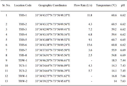 Authors are grateful to the Biochemistry Department (Quaid-i-Azam University, Islamabad), PINSTECH (Pakistan Institute of Nuclear Science and Technology, Islamabad) and PCRWR (Pakistan Council for Research in Water Resources, Islamabad) for providing facilities for geochemical analysis of water samples. Special thanks to Mr. Usman (Radiation Physics Lab, COMSATS Islamabad), Mr. Tahir Hussain and Mr. Emadullah Khan (Department of Geology, Abdul Wali Khan University, Mardan, Pakistan) for their valued assistance during field work. Respected reviewer is also acknowledged for his contribution in the improvement of this manuscript.