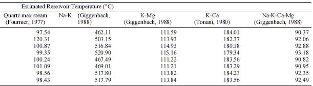 Reservoir temperatures based on quartz (conductive) geo-thermometer using equation (3) range between 96.01 and 122.53ºC, and between 97.54, and 120.31ºC based on quartz (adiabatic) geo-thermometer using equation (4) (Table III). The calculated reservoir temperatures suggest a near equilibrium with respect to quartz and undersaturation with respect to amorphous silica, indicating that concentration of quartz in the fluid is controlled either by adiabatic (max steam loss) or conductive (no steam loss) cooling processes.