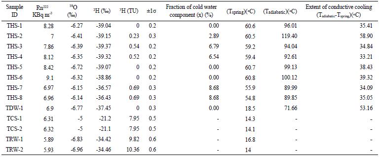 (10)where Tadiabatic is water temperature of adiabatic mixing, Trt is the estimated reservoir temperature, Tgw is temperature of shallow groundwater and x is the percentage fraction of groundwater in thermal water. Then the extent of conductive cooling is the difference between Tadiabatic and Ths the measured surface temperature of the hot spring (Table IV). The results show that conductive cooling range between 33.21 and 58.9ºC, which is a significant portion of heat loss in the Tattapani hot springs. Thus, it is deduced that surface temperature of thermal water is mainly controlled by conductive cooling along with some mixing of shallow groundwater controlled by seasonal fluctuations.