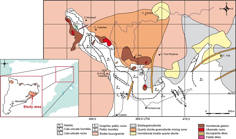 The olivine hornblendites of the MMC appear as metric enclaves in hornblende (mela) gabbros. These along with leucogabbros and quartz diorites (Enrique, 1983; Butjosa et al., 2013) crop out scattered over an area that is 4km long by 2.5km wide near the locality of Hortsavinyà (Enrique, 1983; Fig. 1), in the Catalan Coastal Ranges. All these rocks are located at the contact between the biotite granite of the Montnegre massif and the Siluro-Devonian country rocks formed by calcsilicate and pelitic metasediments. These metasediments were affected by an intense contact metamorphism that transformed them into marbles, calc-silicates and pelitic hornfels during the intrusion of the postectonic Variscan Montnegre granitoids.