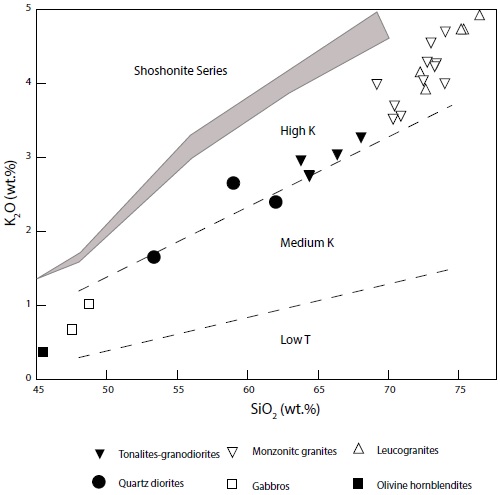 The Montnegre granitoids are hornblende-biotite tonalites, biotite granodiorites and monzonitic granites and leucogranites intruded at shallow levels (Enrique, 1990). Along with the MMC, they define a calc-alkaline trend, similar to that of other coeval associations of ultramafic-mafic rocks and granitoids in the Pyrenees (e.g.Roberts et al., 2000; Vilà et al., 2005). Although the geodynamic setting is not well constrained, trace element compositions (viz. Rb, Y, Nb) of the granitoids are comparable to those formed in volcanic arc settings (Enrique and Solé, 2004). In the K2O vs. SiO2 diagram (Fig. 2), the MMC rocks and granitoids define a trend that straddles the boundary between medium- and high-K calcalkaline series. Specifically, the olivine hornblendites are within the medium-K field.