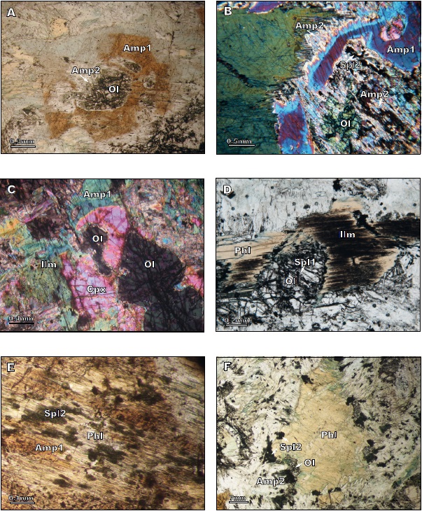 The olivine hornblendites show poikilitic texture defined by amphibole oikocrystals (1-2cm at their short axis) including olivine (Fig. 3A) and less frequently clinopyroxene and orthopyroxene. The oikocrystals of amphibole are brown to green in colour at the core (Amp1) and green to colourless displaying fibrous habit, towards the rim and around the inclusions (Fig. 3A; B). Crystals with fibrous habit (Amp2), with 100µm at the short axis, also form pseudomorphs after earlier anhydrous mafic silicates. These pseudomorphs can be enclosed by Amp1 crystals or located between them. The brown cores of Amp1 often show angular forms and sharp edges, against the green and colourless rims (Fig. 3A), and frequent ilmenite lamellae following the cleavage (Fig. 3C). Compositions of brown-green Amp1, in oikocrystal cores, are of tschermakite and Mg-hornblende, respectively. They differ from compositions of Amp2, which are actinolite, tremolite, cummingtonite or anthophyllite. Olivine, with forsterite (Fo) range from 80 to 73%, appears as millimetric (up to 2mm) somewhat skeleton or amoeboid crystals (Fig. 3C), partially altered to serpentine+magnetite filling cracks. It can be partially or totally replaced by Amp2phlogopite-spinel clusters. Clinopyroxene composition is chromian diopside or augite close to diopside. It forms anhedral crystals (200µm in size), which can enclose olivine (Fig. 3C), and is always transformed to amphibole (Amp2) which forms patches within the clinopyroxene crystals. This is also the case of orthopyroxene (enstatite) that is only present as relics within Amp2 pseudomorphs. Phlogopite mode is abundant (up to 7.6% in volume; Butjosa et al., 2013) forming i) isolated subhedral crystals (200µm at their long axis) with ilmenite lamellae at the core (Fig. 3D); ii) intergrown anhedral crystals (or corroded crystals?) with brown-green Amp1 (Fig. 3E); and iii), clusters together with spinel ± Amp2 (Fig. 3F) pseudomorphing olivine (Enrique and Galán, 1989). Phlogopite can be partially or totally altered to chlorite. More detailed petrographic description and compositional data of previously mentioned silicates were provided by Galán (1987b), Enrique and Galán (1989).
