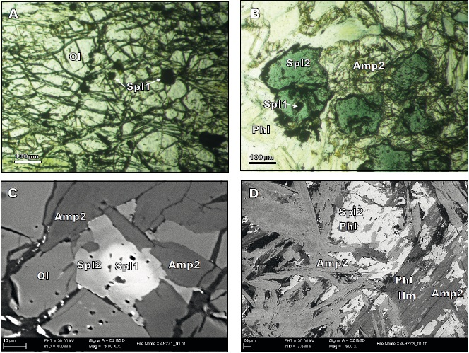 Spinel is the most abundant accessory mineral (up to 2.8% in volume; Enrique and Galán, 1989). Two types have been differentiated: Spl1 as small euhedral to anhedral black crystals of 10-2µm (Spl1), usually included in olivine and in other green spinel (Spl2) (Fig. 4A; B); Spl2 as green euhedral to anhedral crystals up to 10µm in size. The latter is the most abundant spinel, often forming clusters or pseudomorphs along with phogopite and Amp2 (Fig. 4D) after olivine. Less frequently, Spl2 follows the cleave of phlogopite included in Amp1 (Fig. 3E). Contacts between the two types of spinel are either sharp or gradual (Fig. 4A; C). Ilmenite is also an accessory mineral, either as isolated inclusions in Amp1, and more rarely in olivine, or as lamellae in brown Amp1 and phlogopite.