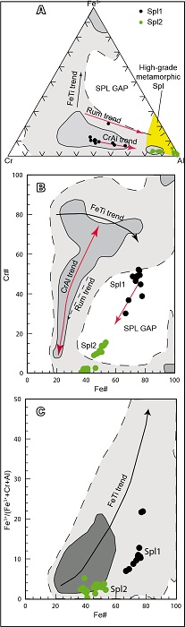 Both types of spinel follow a CrAl trend, similar to the Rum trend (Fig. 5A; B) but at higher Fe# than most CrAl trends (Barnes and Roeder, 2001) (Fig. 5B). This trend implies an increase in Al mainly at the expense of Cr and with a moderate Fe3+ increase (Fig. 5C). Therefore, it is inferred that the main operating substitution was (Fe2+.-1Cr-1 = MgAl, with subordinate contribution of the magnetite substitution: Fe2+Fe3+= Mg-1Cr-1(Al-1).
