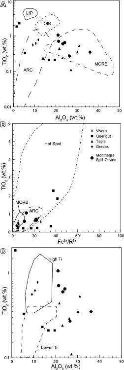 In spite of the previous drawbacks, Al2O3 (therefore Cr#) and TiO2 components are less susceptible to experiment subsolidus re-equilibration, if spinel is trapped by olivine: this phase has low diffusivity for trivalent (Al, Cr) and tetravalent (Ti) cations (Scowen et al., 1991; Barnes, 1998). Using Al and Ti contents of spinel as proxies for the co-existing melt composition also offers other advantages (Kamenetsky et al., 2001): i) olivine is the first phase to crystallize from all virtually mantle-derived melts; ii) olivine remains on the liquidus at least during spinel crystallization; iii) Fo composition in olivine can be used as an index of fractional crystallization; and iv), olivine protects effectively enclosed spinel crystals from exchange reactions with other phases. Therefore, Al2O3 and TiO2 of spinels were related to their abundance in co-existing melt over large compositional ranges of both phases (Kamenetsky et al., 2001). In the case study, Al2O3 and TiO2 of most Spl1 are within these compositional intervals (3.0-39 Al2O3% and 0.04-3.90 TiO2%) and four of these analyses are from Spl1 inclusions in olivine (Fig. 4A). Therefore, we can assume that the concentrations of both components in these Spl1 inclusions were not much perturbed by subsolidus re-equilibration and use them to evaluate the nature of the co-existing melt. It is observed that most of these Spl1 inclusions would have been in equilibrium with MORB-type basalts (Fig. 6A), which does not fit the geological setting of the MMC. In spite of it, we can infer that the studied hornblendites would derive from Al-richer basalts than typical island arc tholeiites or melts from high-Ti calc-alkaline and high-K arc volcanic series (Fig. 6B; Kamenetsky et al., 2001).