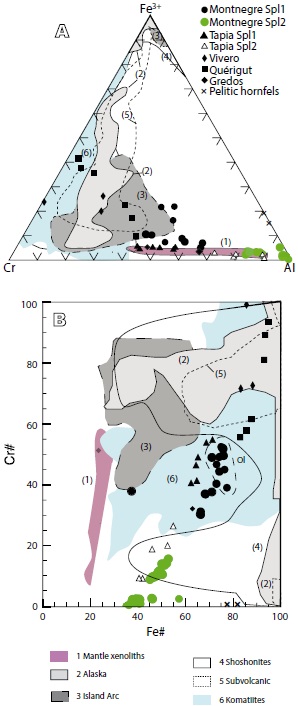 Chromian spinel is frequent in ultramafic and mafic rocks and serves as proxy for the geochemical characteristics of the involved melts (Irvine, 1965, 1967; Dick and Bullen, 1984; Roeder, 1994; Kamenetsky et al., 2001) and for their tectonic settings (Arai, 1992, 1994; Kamenetsky et al., 2001; Arai et al., 2011). However, spinel composition in these rocks also depends on other variables, (Kamenetsky et al., 2001 and references therein): i) ƒO2 during crystallization; ii) crystallization temperature and cooling rates, and iii) perhaps pressure. Moreover, subsolidus re-equilbration of spinel with silicates can deeply modify early magmatic compositions, especially in plutonic rocks (Arai et al., 2011). This type of re-equilibration affects mainly the Mg# of spinel (Kamenetsky et al., 2001; Arai et al., 2011), but also the Cr#, especially in mantle peridotites (Voigt and Handt, 2011).