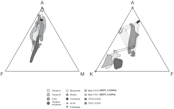 The projection of the Cabeza de Araya plutonic rocks and of possible Al-rich contaminant in the AKF and AFM diagrams (Fig. 9) confirms that the compositions of the Facies A (cordierite-bearing monzogranites-granodiorites) cannot derive only from the assimilation of hornfels or peraluminous metasediments from the Schist-greywacke Complex by Facies B-type rocks (cordierite-free). As in most of the granodiorites from the Iberian Peninsula, the presence of mafic to tonalitic enclaves are also observed in Cabeza de Araya cordierite-bearing monzogranitesgranodiorites and these rocks are often cogenetic with hornblende-bearing diorites and biotite-bearing Ca-rich rocks (tonalites), typical of calc-alkaline magmatism. This post-orogenic calc-alkaline magmatism would be related to basic melt generated by post-collisional adiabatic decompression of the mantle and uprising geotherm, together with crustal thining evolution (Carracedo et al., 2009). In such type of magmas hybridization processes and mingling processes between mafic enclaves and more felsic magmas have been documented (see García-Moreno et al., 2006 and 2007, for the Cabeza de Araya pluton). This hybridization process can modify locally the Al2O3 and CaO activities in the magmas and can lead to the incorporation of mafic phases and plagioclase via mingling processes in the magma.