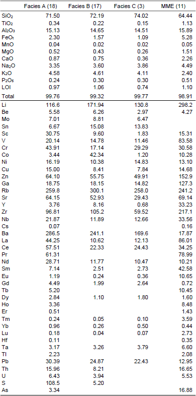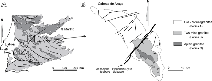 Three different main lithologies are described in the Cabeza de Araya batholith in the original work of Corretgé (1971). Table 1 summarizes the geochemical features of these main facies that are described below.