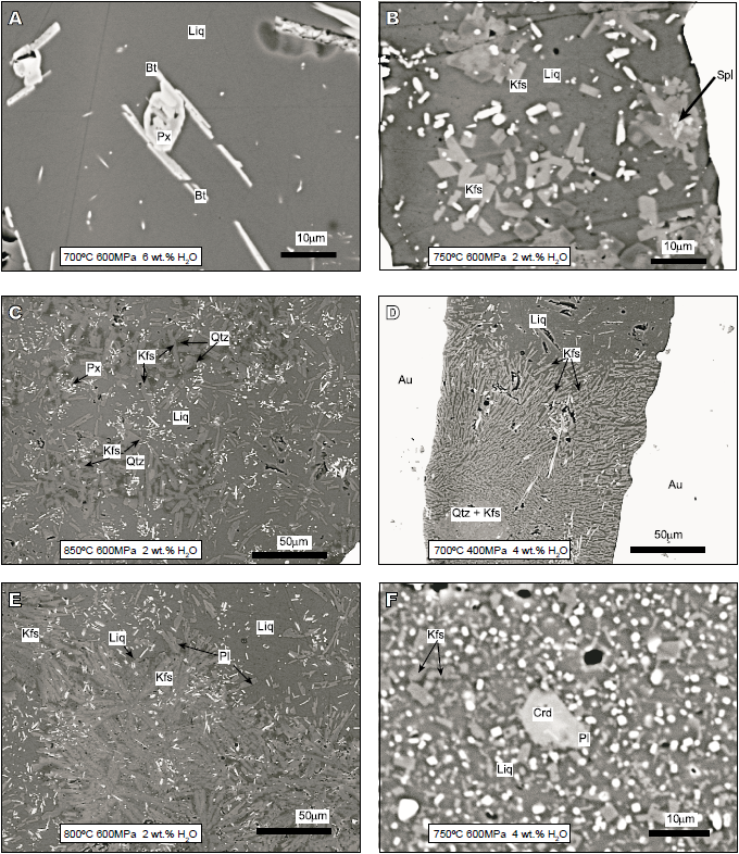 Initially, we performed experiments at 600MPa and 700ºC with three different water contents without adding any mineral seeds. In these experiments, the main ferromagnesian mineral phase was clinopyroxene. This mineral phase has never been described in SM granites. Because cordierite is the most characteristic mafic phase in the natural assemblage, and because garnet may also be stable at high pressure in such composition, seeds of cordierite and garnet were added to the starting material to avoid possible nucleation problems for these phases. The experimental results were similar and clinopyroxene was the main ferromagnesian phase in all doped experiments at 400 and 600MPa, whereas biotite occurred mainly at 200MPa (Table 3).