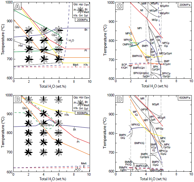 Cpx is the liquidus phase at 600MPa whereas Bt, Opx or Pl (depending on the added water content) are liquidus phases at 200MPa (Opx and Bt are the liquidus phases for 4 and 6 wt.% added water, respectively). The stability fields of mineral phases in the water-undersaturated field were drawn by non-isothermic T-H2O limits (similar to diagrams in e.g.Naney (1983)). These stability fields of the main minerals are detailed below.