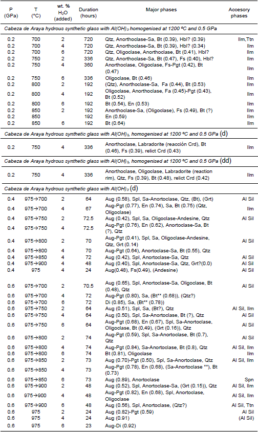 Table 3 summarizes the experimental results obtained at 200, 400 and 600MPa and at a temperature range between 700 and 975ºC. Unfortunately, the size of the crystallized phases in almost all the runs were too small to have a complete set of data on the geochemical characterization of the different phases for all the tested conditions. Nevertheless, Table 3 shows the Mg# [Mg#=Mg/(Fetot+Mg) molar] of the ferromagnesian phases and the An content in plagioclase when we could obtain proper analyses.