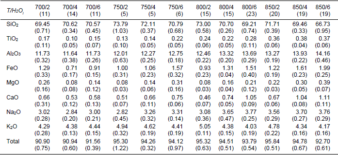 The compositions of the glasses varied mainly with temperature. Typical compositions are given for 200MPa in Table 4. The general behaviour is as follows: MgO concentrations were low (beyond the analytical resolution) and the FeO and TiO2 decreased with decreasing temperature, as expected. SiO2 generally increases with decreasing temperature, the opposite is observed for Al2O3. It is worth noting that the highest Al2O3 concentration in glasses from experiments in which feldspars were observed was lower than 13.5 wt.% Al2O3 and was systematically lower than that of the starting material (14.4 to 14.9 wt.%; Table 2). In contrast to K2O, the Na2O and CaO concentrations were systematically lower in glasses containing feldspars and their proportions determined the melt compositions. CaO decreased with the increase in the proportion of feldspars (i.e. decreasing temperature or decreasing water content).