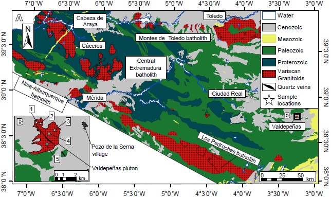 The easternmost intrusion included in the CáceresValdepeñas alignment is the here studied Valdepeñas pluton, also known as Pozo de la Serna pluton in the regional literature. This small granitic intrusion crops out next to the CM-412 road (kilometric points 46 to 48) that connects the villages of Valdepeñas and Pozo de la Serna (Ciudad Real province, Fig. 1A; B). Perhaps because of its small size, no detailed petrological characterization of this massif has been done before. This contribution presents the petrography, mineral geochemistry, conventional and isotope (Rb-Sr; Sm-Nd) whole-rock geochemistry, and zircon U-Th-Pb geochronology of this pluton. Based on these data, we discuss the magma sources involved in the genesis of this pluton in the framework of the petrogenetic models proposed for the late-Variscan magmatism of the southern CIZ (SW Iberian Massif). The conclusions of the study should be of special interest for future studies on the origin of the granitoids grouped in the so-called mixed series (“Serie Mixta”) granites.