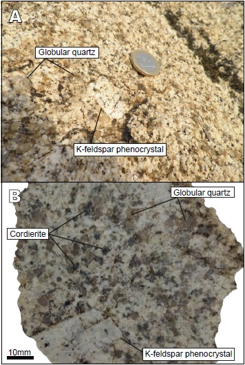 The Valdepeñas pluton crops out in a nearly circular small area (~3km2) surrounded by the Cenozoic cover, which impedes the observation of intrusion relations with the metasedimentary units (Fig. 1A). Nonetheless, despite its apparently small size at outcrop scale, gravimetric data indicate that this intrusion could be ~10km wide and <9km deep (Bergamín and De Vicente, 1985). The pluton is constituted by a cordierite-bearing porphyritic monzogranite, being noteworthy the absence of mafic microgranular enclaves (MME). The studied monzogranitic rocks are massive and homophanous. Their porphyritic character is defined by the presence of alkali feldspar phenocrysts (up to 4cm long), which are included in a biotite-bearing medium- to coarse-size granitic groundmass. Abundant globular quartz aggregates (up to 1.2cm long) and cordierite (0.8cm long) stand out in the groundmass (Fig. 2A; B).