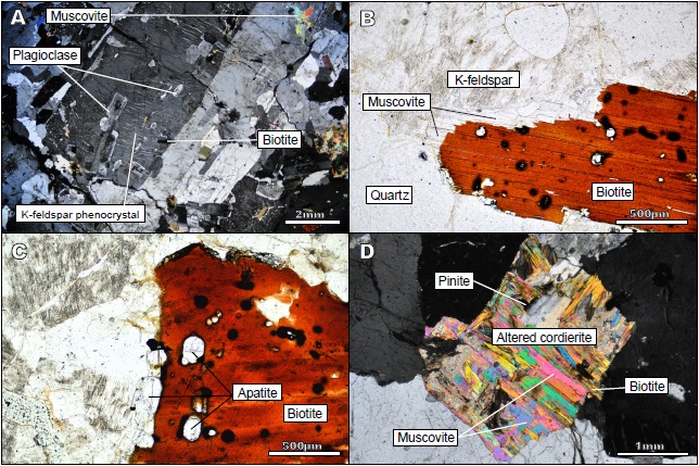Alkali feldspar phenocrystals are up to 4cm long and subhedral. They often exhibit perthitic exsolutions, and Frasl inclusions of biotite, plagioclase, apatite and muscovite (Fig. 3A). Plagioclase (1–5mm; 30–40 vol.%) is idiomorphic, and alteration to sericite is observed at crystal cores. Quartz (25–35 vol.%) appears as xenomorphic globular crystals, generally defining glomeroporphyritic aggregates (Fig. 2A; B). Biotite (1–2mm; 3–8 vol.%) is idiomorphic, can be partially or totally transformed to secondary muscovite (Fig. 3B), and frequently contains inclusions of apatite, monazite and zircon (Fig. 3B; C). Cordierite (≤10mm; 3–6 vol.%) appears often completely altered to pinite, muscovite and biotite (Fig. 3D). Muscovite appears mainly as alteration of cordierite and biotite, but also as idiomorphic primary crystal. Since muscovite can replace completely biotite, sometimes it is not possible to discriminate between primary and secondary muscovite. Apatite may occur as idiomorphic prisms (100–400µm) included into biotite and alkali feldspar, or as isolated crystals in the groundmass (Fig. 3C).