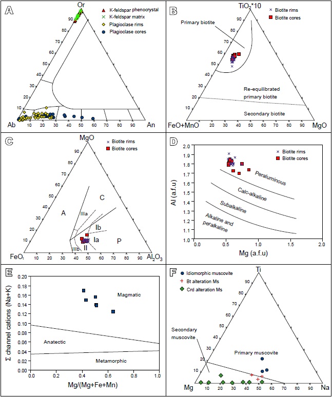 The composition of alkali feldspar phenocrystals is the same as the subidio- xenomorphic (8–9mm; 15–30 vol.%) ones from the groundmass (Or89-98; Fig. 4A). Plagioclase is compositionally zoned, with variable compositions for the cores (up to An59) and rims (An02-28; Fig. 4A). The biotite is primary (Fig. 4B) and compositionally rich in Al (Fig. 4C; D), though they plot in the calc-alkaline field of the FeOt–MgO–Al2O3 diagram (Rossi and Chevremont, 1987). Cordierite is magmatic (Fig. 4E) and shows some variations in MgO (4.82–8.06 wt.%) and FeO (7.90%–11.93 wt.%). Muscovite with primary features is scarce and has a not very different composition from the one formed by the alteration of biotite (Fig. 4F).