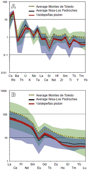Trace element patterns normalized to total-crust (Rudnick and Gao, 2003) of the Valdepeñas monzogranite are similar to the average normalized pattern of the NisaAlburquerque-Los Pedroches alignment granites, while markedly depleted (in the most compatible elements) when compared to that of the Montes de Toledo alignment (Fig. 5A). Similarly occurs with the chondrite-normalized REE patterns, which are practically equal to the average of the Nisa-Alburquerque-Los Pedroches alignment granites (slightly depleted after Ho), and markedly depleted regarding the average of the Montes de Toledo alignment (Fig. 5B). A comparison to other rocks of the Cáceres-Valdepeñas alignment has not been attempted because of the difficulty to obtain enough trace element data from literature. We have only considered the case of the Logrosán cupola, which shows similar normalized REE patterns to those of the Valdepeñas monzogranite (Chicharro et al., 2014).