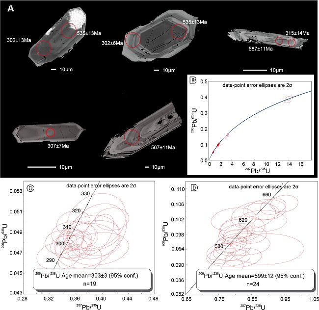 Hence, out of the total analysis, a group of concordant values, most of them from rim or outer areas, allows to assign an emplacement age to the Valdepeñas pluton of 303±3Ma, obtained as weighing the average of 206Pb/238U ages of individual analyses (Fig. 6C). Another group corresponds to 24 spots located mainly at inherited cores, providing ages between 552Ma and 650Ma. Although these 24 results do not define a concordant age, a 206Pb/238U mean age of 599±12Ma (Fig. 6D) can, nonetheless, be obtained. Finally, a small number of analyses point to. at least, another older zircon formation event (Fig. 6A; Table 2), although it would be necessary to obtain more results in order to consider further these older values.