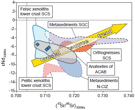 The emplacement age obtained for the Valdepeñas pluton (303±3Ma; Gzhelian) coincides with that of the gravitational collapse and erosive dismantling of the Variscan orogeny (Martínez Catalán et al., 2009). This late extensional regime could have led to an important decompression of the upper mantle and the lower thickened crust. Decompression could have induced mantle melting and emplacement of mafic magmas in the middle crust. The heat provided by these mafic magmas could have contributed to the increase of the already high temperatures (thermally incubated during crustal thickening) of the materials forming lower and middle portions of the crust, and their melting generated peraluminous magmas (Annen et al., 2006; Castro, 2014). Nevertheless, in the CIZ, basic rocks related to peraluminous granitoids are scarce, or notably younger than crustal melting events (Villaseca et al., 1998b, Bea et al., 1999; Bea et al., 2006; Merino Martínez et al., 2014). In this crustal thickening scenario mantle contribution would imply a normal conductive heat through the base of the lithosphere (Patiño Douce et al., 1990). In this context, the main heat supply for crustal melting would be the radiogenic heating due to the enrichment of the crustal sources in heatproducing elements, such as K, Th and U (Bea, 2012). According to this author, a fertile continental crust (more radioactive than the average continental crust) can generate large granitic magmatism after 30–40Ma of thermal maturation. Thus, radiogenic heating of a crustal metaigneous source could induce the generation of the magmas that fed the Valdepeñas pluton. The extrapolation of this petrogenetic model to the origin of peraluminous granitoids in the southern CIZ must be taken with caution since whole-rock geochemistry of the peraluminous granitoids is variable in detail, and whole-rock isotope characterization data are still scarce.