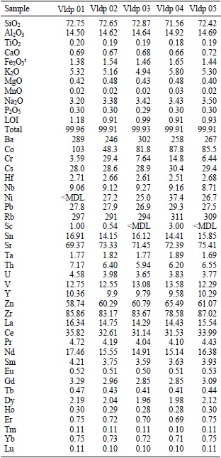 Five samples were selected for whole-rock geochemical characterization (Table 1). The results obtained indicate that variations in major element concentrations are practically negligible. Granitic rocks of the Valdepeñas pluton are compositionally homogeneous (Al2O3=14.50–14.92 wt.%; K2O+Na2O=8.36–9.23 wt.%), acid (SiO2=71.56–72.87 wt.%), low-Ca (CaO=0.66–0.72 wt.%) and phosphorous-rich (P2O5=0.29–0.30 wt.%), with low total Fe2O3t+MgO+TiO2+MnO content (2.02–2.33 wt.%).