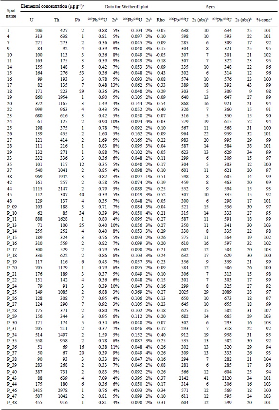 Backscattered electron microscopy images of zircons revealed the common occurrence of internal structures with inherited cores and rims showing different characteristics (Fig. 6). To check the possibility of different ages in those discerned areas, a total of 96 U-Pb analyses were done in 79 grains of zircon by LA-ICP-MS. The signal obtained in each analysis was carefully checked in order to discard the presence of common Pb that cannot be properly corrected by this method or of any other analytical problem. Finally, 54 analyses were considered valid for an age interpretation (Table 2). The representation of all the analysis in the Concordia diagram (Fig. 6B) shows definite differences in the results obtained pointing to at least two groups of ages within these samples.