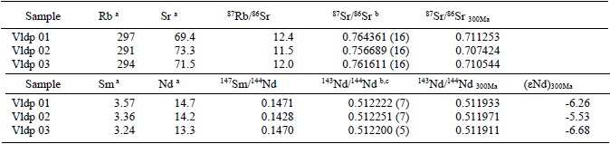 Three monzogranitic samples were selected for whole-rock Rb-Sr and Sm-Nd isotope characterization. The relatively homogeneous Rb, Sr, Sm and Nd concentrations of the analysed rocks (Table 1) are also reflected in their 87Rb/86Sr, 87Sr/86Sr, 143Nd/144Nd, and 147Sm/144Nd isotopic ratios, which vary in a narrow range (Table 3). Considering the zircon crystallization age of the Valdepeñas monzogranite (303±3Ma), initial 87Sr/86Sr ratios and εNd values were calculated at 300Ma. Two samples show almost identical 87Sr/86Sr and εNd values, and the third one shows slightly lower 87Sr/86Sr ratios and less negative εNd values (Table 3). Nevertheless, the three samples give very similar results (Sr300Ma=0.706–0.710; Nd300Ma=0.511909–0.511968), which obviously does not allow any whole-rock radiometric age estimation of the pluton.
