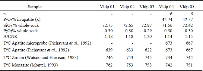 Harrison and Watson (1984) defined an expression for apatite saturation behaviour in melts with 0–10% of H2O and temperatures of 850ºC to 1500ºC but, because of the higher potential of peraluminous melts, Bea et al. (1992) and Pichavant et al. (1992) proposed improvements for this equation. Nevertheless, for rocks with SiO2>70 wt.% these equations are very sensitive to small variations in whole-rock P2O5 concentrations, and small analytical errors could derive in significant changes in calculated saturation temperatures (Janoušek, 2006). Using the GCDkit software (Janoušek, 2006; Janoušek et al., 2006), which assumes a 42 wt.% of P2O5 in apatite, saturation temperatures for apatite in the Valdepeñas monzogranite were calculated. The temperatures provided by the methods of Harrison and Watson (1984) and Bea et al. (1992) seem to be overestimated (~900–1050ºC), while those estimated with the expression of Pichavant et al. (1992) are more suitable for these rocks, comprising temperatures of 622–673ºC (Table 4). An identical temperature range of 667–673ºC is obtained for the analysed two samples using that expression and apatite electron microprobe data (Table 4).